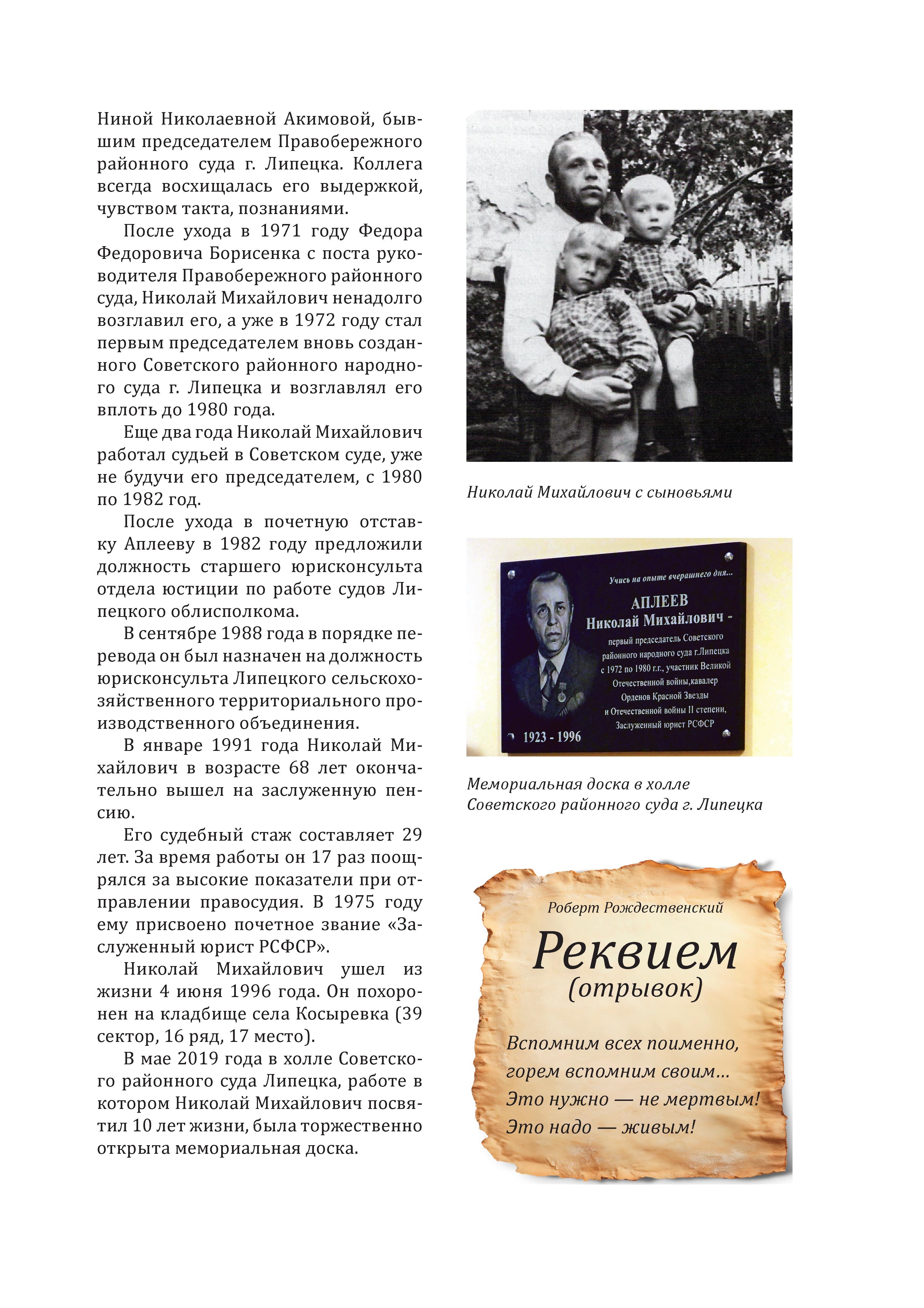 Советом судей Липецкой области при участии Липецкого областного суда, Арбитражного суда Липецкой области, Управления Судебного департамента в Липецкой области, Липецкого регионального отделения «Российского объединения судей», Ассоциации судей в отставке Липецкой области, судов Липецкой области подготовлено издание «Книга Памяти судебной системы Липецкой области». Книга издана к 80-летнему юбилею Победы в Великой Отечественной войне. В ней собрана информация о судьях-фронтовиках и тружениках тыла, работавших в судебной системе, их воспоминания, наградные листы и описания боевых подвигов. Это издание — дань памяти и уважения всем, кто сражался на фронте в годы войны, ковал Победу в тылу, а затем, в мирное время, стоял у истоков становления и развития судебной системы Липецкой области, трудился на благо общества и государства, защищая закон и правопорядок. ![]() ![]() |
