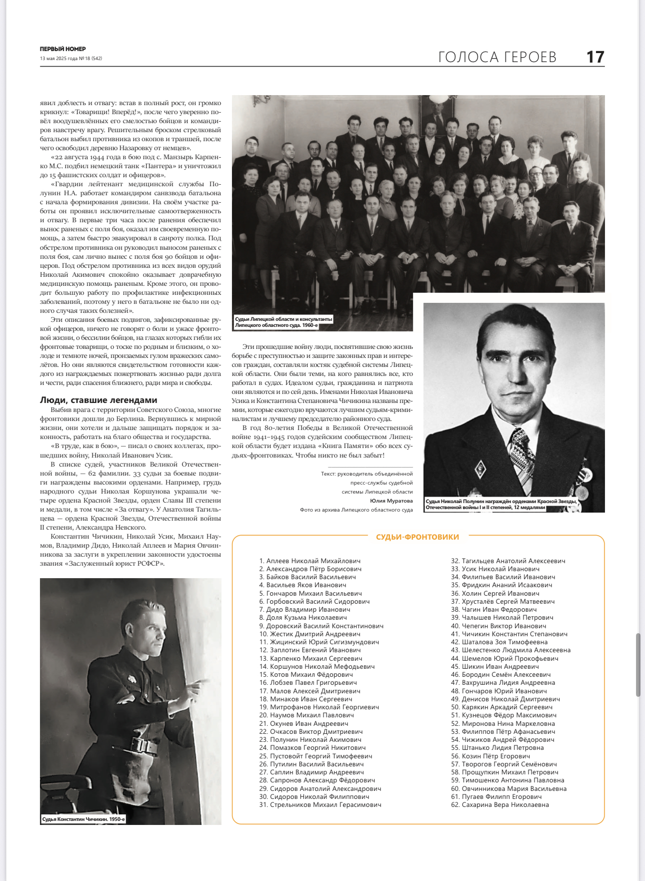 "На службе Родине" - в газете "Первый номер", посвященном празднованию 80-летия Победы, опубликована статья о судьях-фронтовиках. Статья доступна в электронной версии газеты |
